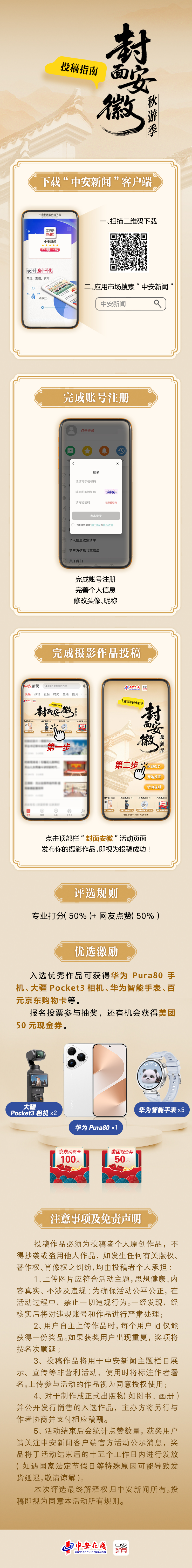 5、評選與展示:征集結(jié)束后,中安新聞客戶端將組織專家評審團(tuán)對作品進(jìn)行評選(專業(yè)打分+作品傳播效果),擇優(yōu)在客戶端“封面安徽”專欄進(jìn)行展示,并推薦部分優(yōu)秀作品至安徽省主流媒體平臺刊發(fā)。